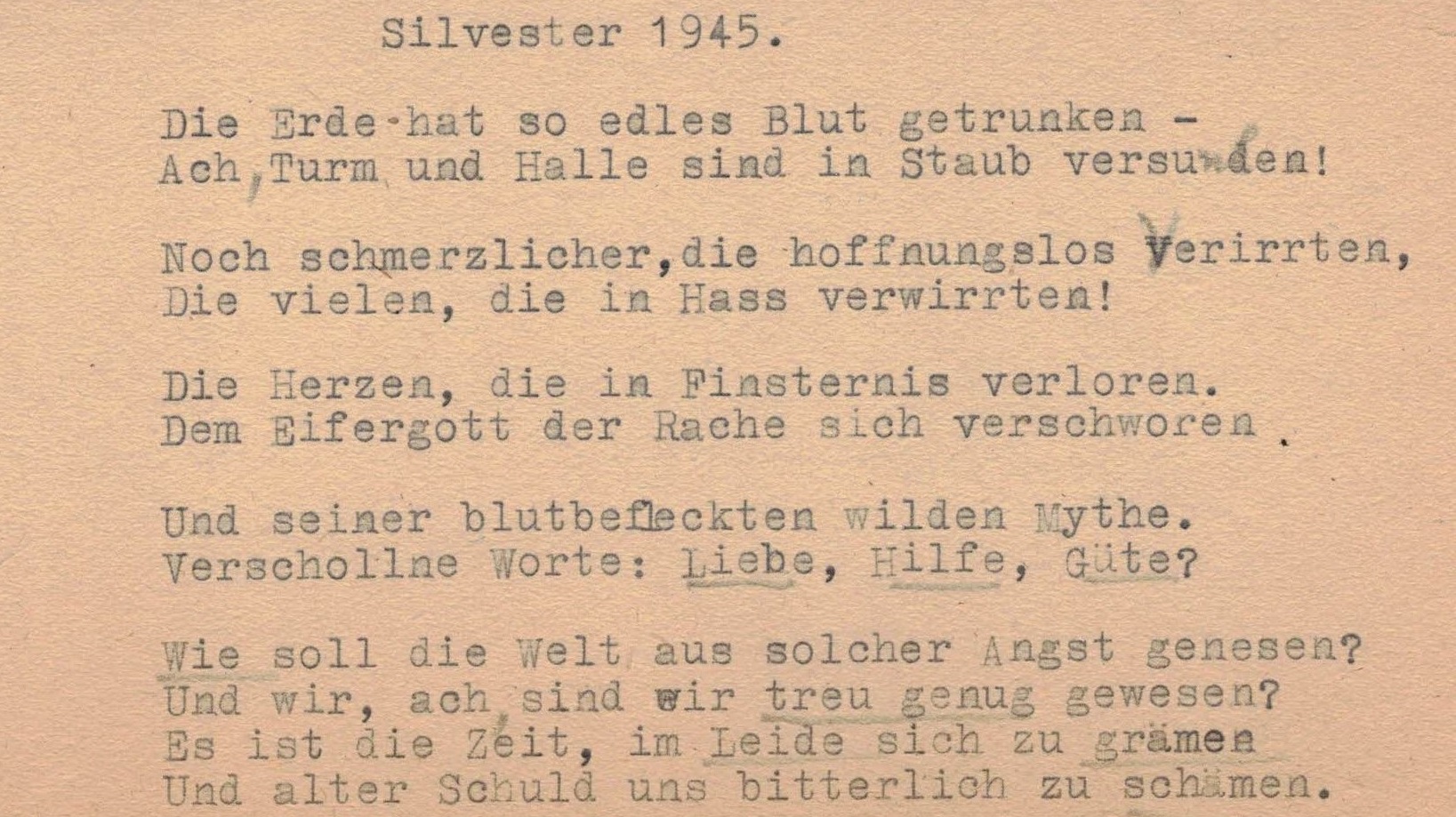 Für den Liebhaber kommt die Stunde der Bewährung, wenn das geliebte Wesen in Not ist. Dann zeigt sich, ob zur Liebe, die ja immer auch sich selbst meint, noch andere Kräfte treten, die Kräfte des Mutes und des Vertrauens, der Wille und die Tat. Für die kulturschaffenden Menschen ist die Stunde der Bewährung jetzt gekommen, wo wir trotz allem Mut und Vertrauen bewahren müssen; jetzt wird es sich zeigen, (…) ob wir wirklich Kräfte in uns haben, ob wir es fertigbringen, Licht in die Finsternis zu tragen. In die Finsternis, die die Trümmer bedeckt und die trauernden Seelen umhüllt. Die Herzen sind müde und beladen, sie leiden bei ehrlichen Menschen unter dem Gefühl der Schuld oder wenigstens der Mitschuld, und der rechnende Verstand neigt zur Skepsis nach so vielen Irrgängen, an denen wir selbst beteiligt waren. Der Verstand blickt in unsere deutsche Welt durch ein Gitter furchtbarer Zahlen, die eine erschreckende Sprache sprechen, und zur Müdigkeit und Skepsis tritt eine Verwirrung der Geister ohnegleichen, weil wir Propaganda gehabt haben anstatt Kultur, weil die Irrlehre der Rassentheorie und die Irrlehre vom Herrenvolk naturgemäß noch nachwirken, weil sie die einfachen sittlichen Grundbegriffe verdrängt haben. (…)